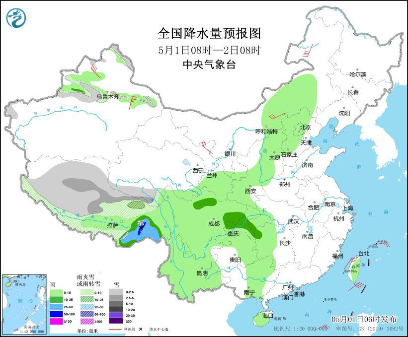 From 08: 00 on May 1 to 08: 00 on May 2,There is little to medium snow or sleet along the Tianshan Mountains and most of the Qinghai-Tibet Plateau in Xinjiang. There are moderate to heavy rains in parts of Ili Valley in Xinjiang, southeastern Tibet, northern Sichuan Plateau, eastern Sichuan and Chongqing, among which there are heavy rains (50-60 mm) in parts of southeastern Tibet. There are 5 ~ 7 winds in parts of northern and eastern Xinjiang, most of Inner Mongolia, Hexi in Gansu and central North China (see Figure 1).