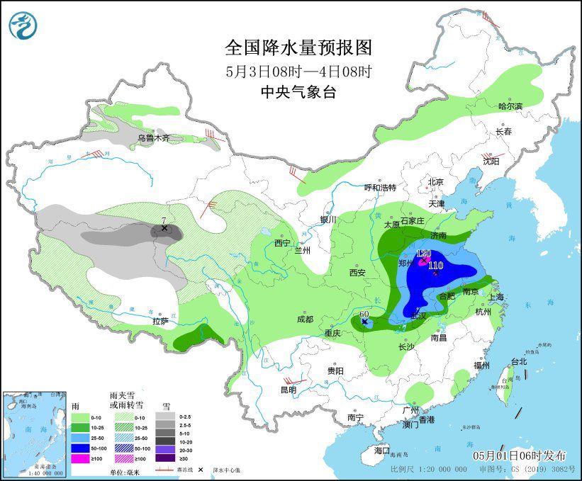 From 08: 00 on May 3 to 08: 00 on May 4,There are small to medium snow or sleet in parts of Yili River Valley and South Xinjiang Basin in Xinjiang, northern and southwestern Tibet, and central part of northwest China, and moderate to heavy snow (5 ~ 7 mm) in parts of western Qinghai. There are moderate to heavy rains in parts of southern North China, Huanghuai, Jianghuai and Jianghan, among which there are heavy rains or heavy rains (100 ~ 120 mm) in parts of southern Shandong, eastern and southern Henan, central and northern Anhui and eastern Hubei. There are 5 ~ 7 winds in parts of eastern Xinjiang, northwestern Inner Mongolia, central Liaoning, northern Qinghai and central Yunnan (see Figure 3).